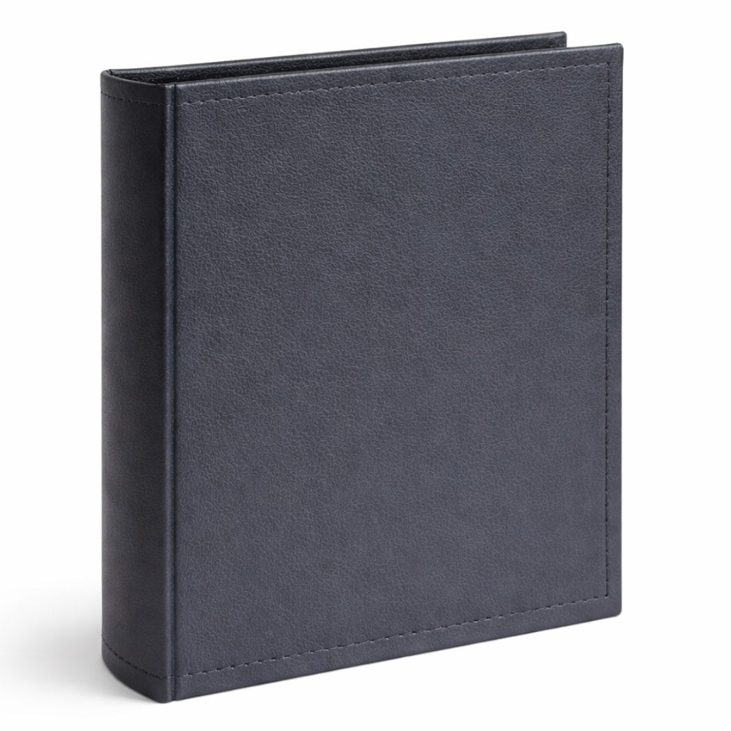 Album posiada trwałą okładkę wykonaną z grafitowej ekoskóry o delikatnej fakturze, co zapewnia pewny chwyt i estetyczny wygląd. Widoczne precyzyjne przeszycia na brzegach okładki wzmacniają konstrukcję i dodają jej charakteru. Klejone łączenie grzbietu gwarantuje stabilność i długotrwałe użytkowanie albumu, bez obaw o wypadanie stron.