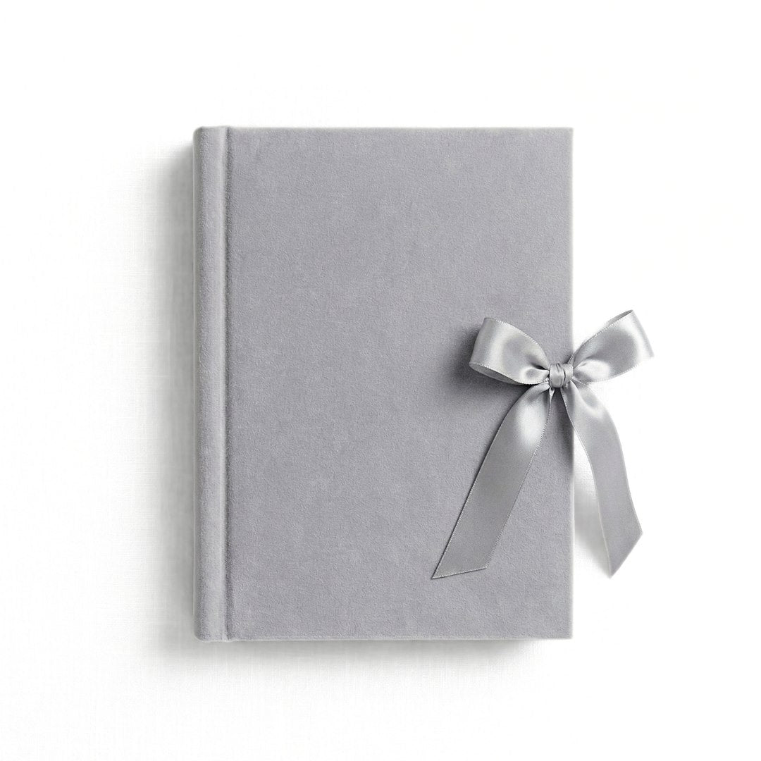 Album GEDEON KD4650VELVETMIST to album kieszeniowy, zaprojektowany do przechowywania 50 fotografii w formacie 10x15 cm. Jego okładka została wykonana z szarego aksamitnego weluru, co nadaje mu miękką fakturę i subtelny wygląd. Welurowa oprawa jest przyjemna w dotyku i dodaje albumowi charakteru. Na prawej krawędzi okładki znajduje się ozdobna, satynowa wstążka zawiązana w kokardę, która stanowi delikatny akcent dekoracyjny.