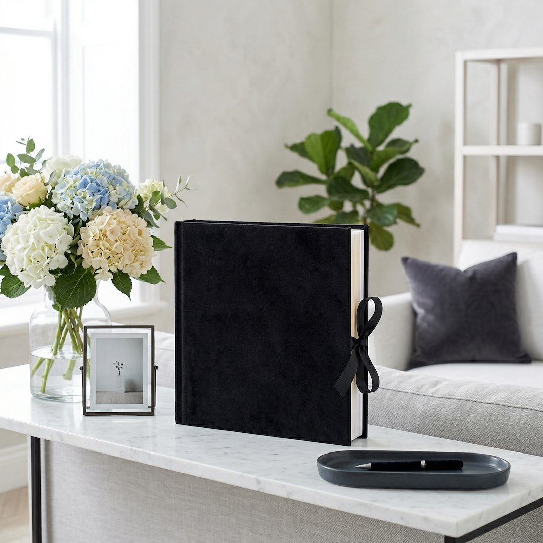 Front albumu zdobi elegancka, czarna satynowa kokarda, która dodaje całości wyrafinowanego charakteru. Ten detal podkreśla estetykę produktu, czyniąc go odpowiednim elementem wystroju wnętrza. Album łączy funkcjonalność z dbałością o szczegóły wizualne.